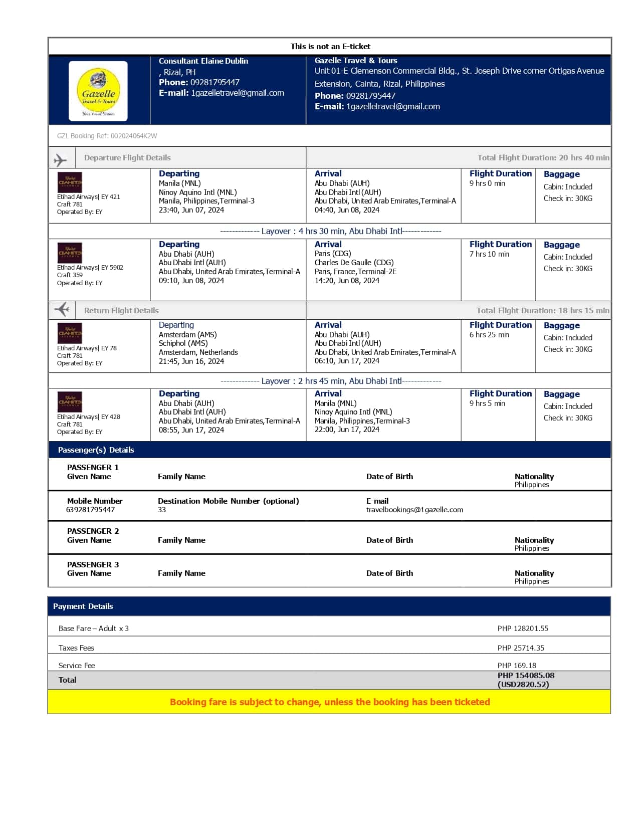 • These reservations will be cancelled automatically by default. The auto-cancellation is done by the airline, not by Gazelle Travel and Tours. You don’t need to use these ticket reservations, but if you choose to stick to it, please let Gazelle Travel and Tours know so they can finalize the booking of those flights for you. The cancellation date of the flight reservation depends on the airline. Fare is not guaranteed and is subject to change depending on the booking class fare sale availability.