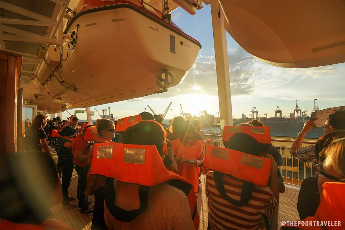 As soon as everyone is settled, there will be a safety drill that you are required to participate in. It is extremely important that you are familiar with the ship’s geography and the directions you need to take in case of an emergency.