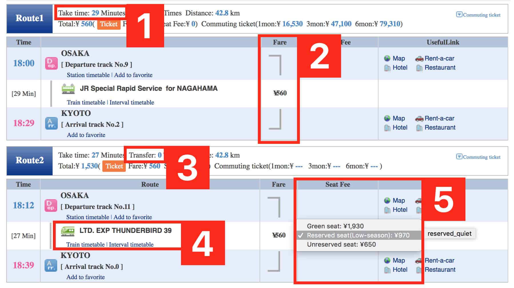3. Number of Transfers. Some routes may be faster but might include multiple transfers, which can be problematic if you’re carrying luggage or traveling with children or elderly. Walking times are also indicated so make sure you take that into consideration.
