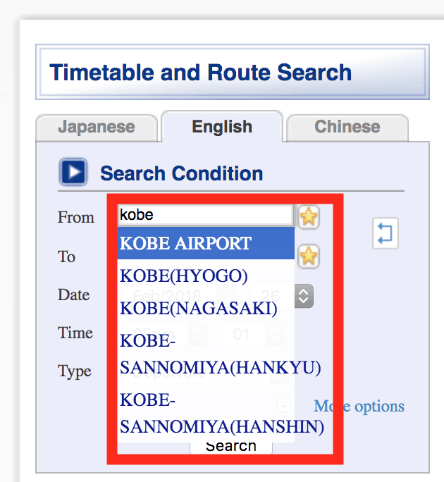 • Some stations share the same name. Good news is, Hyperdia usually has a differentiating tag. For example, there is a KOBE STATION in Hyogo Prefecture and there is another station of the same name in Nagasaki. Both stations will automatically appear when you type KOBE but they are marked as (HYOGO) and (NAGASAKI) respectively.
