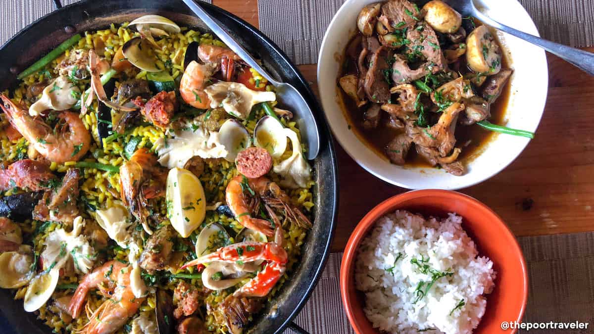 The menu is predominantly Spanish. The bestseller? Its signature El Cocinero Paella, which is a panful of flavorful risotto topped with chicken, chorizo, mushrooms, fish, crabs, shrimps, squid, and mussels. It can feed up to four hungry travelers. It’s a bit too pricey though. If budget is a concern, try their paella negra instead. At P720, it is the cheapest in their paella roster. Then wash it down with a glass of malunggay juice (moringa juice) mixed with calamansi.