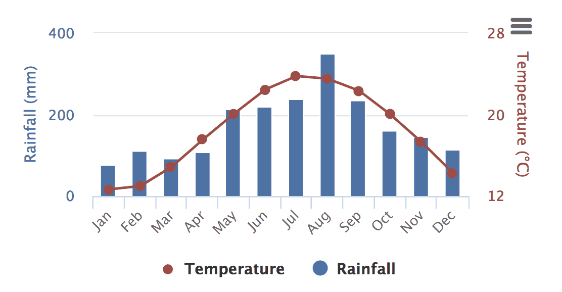 If you look at the precipitation pattern above, it is very similar to the Philippines but much cooler.