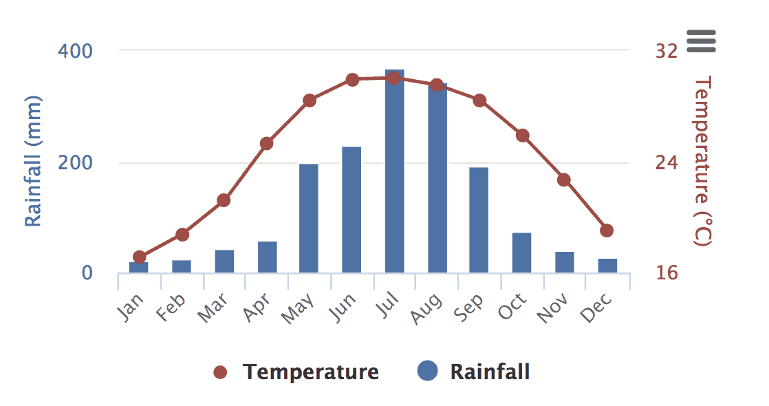 If you can help it, the season you should avoid is summer. This is the hottest and wettest period of the year. Although the average temperature is just around 30C, the mercury can soar to as high as scalding 40 in July. Rainfall numbers also rise dramatically as soon as May kicks in and peaks in July.